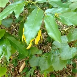 假鹰爪(学名:Desmos chinensis Lour.)是番荔枝科,假鹰爪属直立或攀援灌木,除花外,全株无毛;枝皮粗糙,叶片薄纸质或膜质,长圆形或椭圆形,少数为阔卵形,上面有光泽,下面粉绿色。花黄白色,单朵与叶对生或互生;花梗无毛;萼片卵圆形,外轮花瓣比内轮花瓣大,长圆形或长圆状披针形,两面被微柔毛,内轮花瓣长圆状披针形,花托凸起,雄蕊长圆形,药隔顶端截形;心皮长圆形,柱头近头状,果有柄,念珠状,种子球状,夏至冬季开花,6月至翌年春季结果。