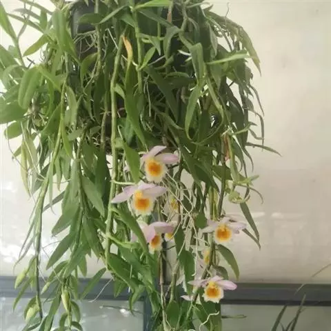 报春石斛,是兰科石斛属植物,茎下垂,厚肉质,圆柱形,不分枝,具多数节;叶纸质互生于整个茎上,…
