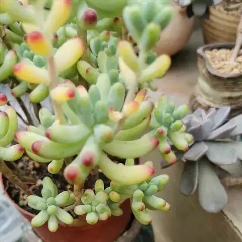 玉米石是景天科、景天属植物。多年生草本多浆植物。植株低矮丛生,多分枝。叶膨大成圆筒形、卵形或近小球形,…