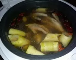 鸡爪8个,香菇10克,冬笋15克,火腿15克,熟鸡油10克,精盐2克,味精1克,绍酒10克,葱姜汁…