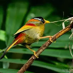 银耳相思鸟小型鸟类,体长14~18厘米。头顶黑色,耳羽银灰色,前额橙黄色;外侧飞羽橙黄色,基部朱红色,…