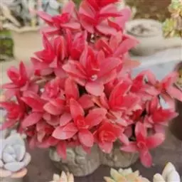 叶子表面宽厚,富肉质感且带有磨纱质感,看像石头质地;开红色小花,生于植株顶部,倒伞形密生,形状像花…