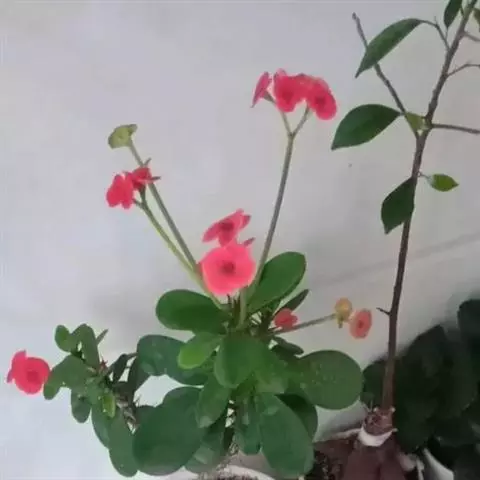 虎刺梅:别称铁海棠,是蔓生灌木植物。茎多分枝,长60-100厘米,直径5-10毫米,具纵棱,密生硬…