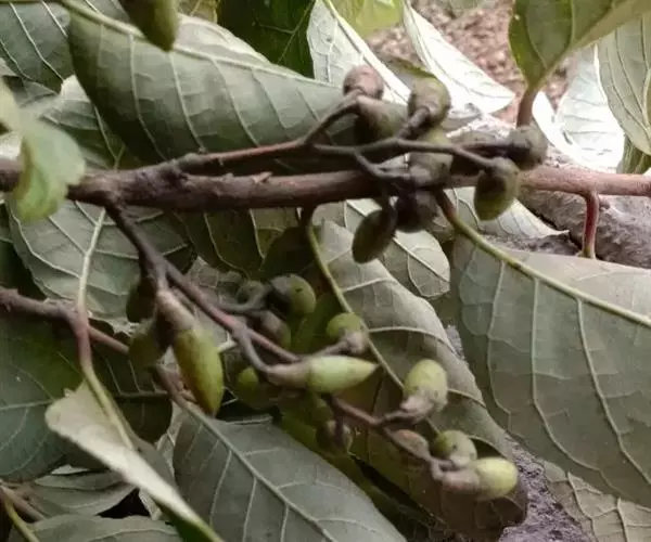 果实长圆形或长椭圆形,长(-8)10-18(-25)毫米,直径6-10毫米,疏被白色星状柔毛或无毛,外果皮肉质,干时黑色,常脱落,内果皮浅褐色,成熟时5瓣开裂;种子多数,长4-7毫米,两端有不等大的膜质翅。花期4-7月,果期8-10月。