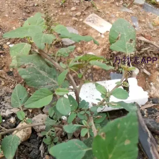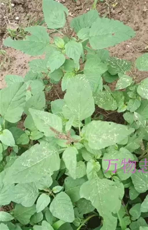 一年生草本,高40-80厘米,全体无毛;茎直立,有不显明棱角,稍有分枝,绿色或带紫色。叶片卵形、卵状矩圆形或卵状椭圆形,长3-9厘米,宽2。5-6厘米,顶端尖凹或凹缺,少数圆钝,有1芒尖,基部宽楔形或近截形,全缘或微呈波状缘;叶柄长3-6厘米,绿色或带紫红色。