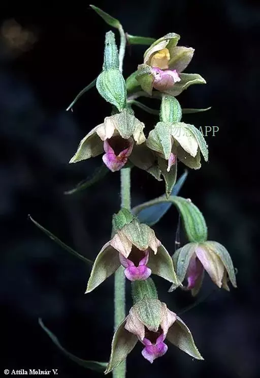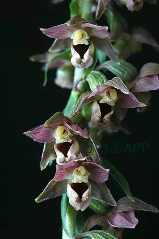 花茎直立,长10-28厘米,被长柔毛,具3-5枚鞘状苞片;总状花序具几朵至20余朵疏生近偏向一侧的花;长8-20厘米;花苞片披针形,长约12毫米,宽4毫米,背面被短柔毛;子房圆柱形,连花梗长8-10毫米,被长柔毛;花较小,白色或带粉红色,半张开;萼片背面被柔毛,具1脉,中萼片狭椭圆状披针形,长7-10毫米,宽3-3.5毫米,舟状,先端急尖,与花瓣粘合呈兜状;侧萼片卵状披针形,长7-9毫米,宽3.5-4毫米,先端急尖。
