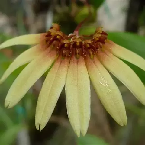 花葶1个,从假鳞茎基部或靠近假鳞茎基部的根状茎节上发出,直立,纤细,远高出叶外,长达9.5厘米,总状花序缩短呈伞状,具2-4 (-7) 朵花;花序柄粗约0.5毫米,疏生3-5枚鞘;鞘膜质,筒状,长约5毫米,紧抱于花序柄;花苞片狭披针形,比花梗连同子房短或有时稍长;花淡黄色;萼片离生,狭披针形,长8-10毫米,基部上方宽1-1.3毫米,先端长渐尖,中部以上(约占整个萼片长的3/5)两侧边缘内卷,具3条脉;侧萼片比中萼片稍长,基部约1/5-2/5贴生于蕊柱足上,萼囊很不明显。