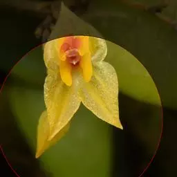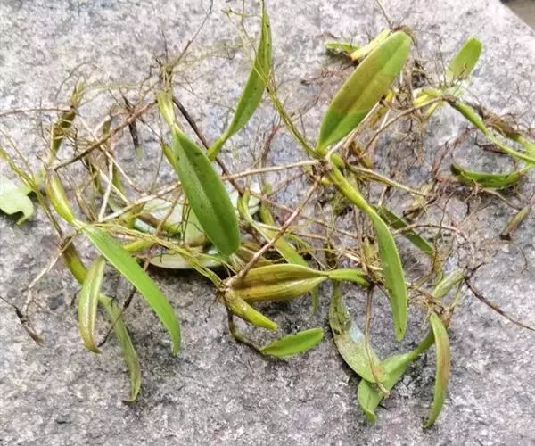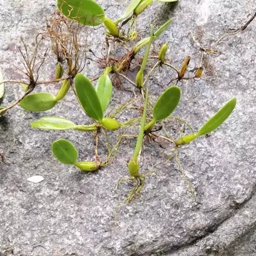 广东石豆兰(学名:Bulbophyllum kwangtungense Schltr.):根状茎粗约2毫米,当年生的常被筒状鞘,在每相隔2-7厘米处生1个假鳞茎。根出自生有假鳞茎的根状茎节上。假鳞茎直立,圆柱状,顶生1枚叶,幼时被膜质鞘。叶革质,长圆形。花葶1个,从假鳞茎基部或靠近假鳞茎基部的根状茎节上发出,直立,纤细,总状花序缩短呈伞状,具2-7 朵花;花淡黄色;萼片离生,狭披针形;花瓣狭卵状披针形,长4-5毫米,中部宽约0.4毫米,逐渐向先端变狭,先端长渐尖,具1条脉或不明显的3条脉,仅中肋到达先端,边缘全缘;唇瓣肉质,狭披针形,向外伸展。花期5-8月。