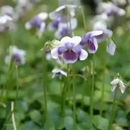 花淡紫色,有暗色条纹;花梗细弱,通常与叶片等长或稍高出于叶,无毛或上部被柔毛,中部稍上处有2枚线形小苞片;萼片卵状披针形或披针形,长4-7毫米,顶端渐尖,基部附属物伸长,长2-3毫米,末端具缺刻状浅齿,具狭膜质缘,无毛或具纤毛;花瓣长圆状倒卵形,长7-9毫米,侧方花瓣里面基部有须毛,下方花瓣连距长10-12毫米;距管状,长2.5-3毫米,直,末端钝;下方雄蕊背部的距角状,长约2.5毫米,顶端尖,基部宽;子房球形,无毛,花柱棍棒状,长约2毫米,基部稍膝曲,顶端平,两侧具较宽的缘边,前方具明显的短喙,喙端具向上开口的柱头孔。