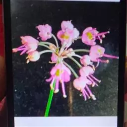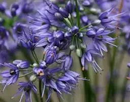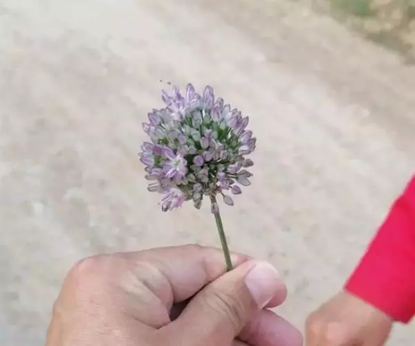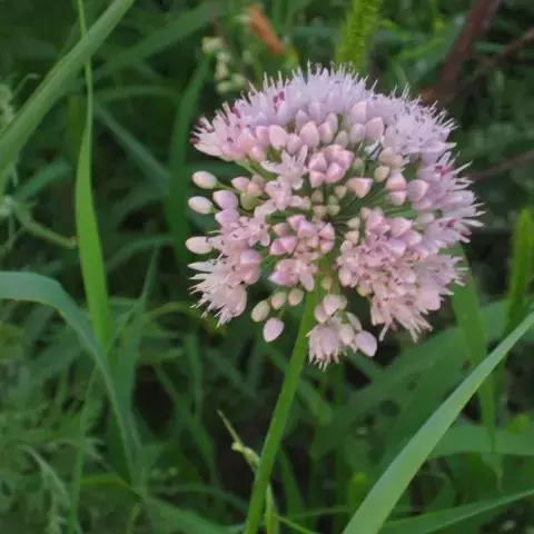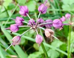 花葶圆柱状,高30-70厘米,1/4~1/3被叶鞘;总苞2裂,比花序短;伞形花序半球状至球状,具多而密集的花,或间具珠芽或有时全为珠芽;小花梗近等长,比花被片长3~5倍,基部具小苞片;珠芽暗紫色,基部亦具小苞片;花淡紫色或淡红色;花被片矩圆状卵形至矩圆状披针形,长4~5.5毫米,宽1.2~2毫米,内轮的常较狭;花丝等长,比花被片稍长直到比其长1/3,在基部合、生并与花被片贴生,分离部分的基部呈狭三角形扩大,向上收狭成锥形,内轮的基部约为外轮基部宽的1.5倍;子房近球状,腹缝线基部具有帘的凹陷蜜穴;花柱伸出花被外。花果期5~7月。