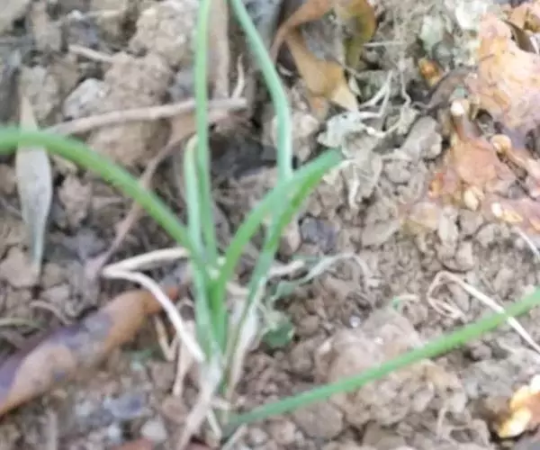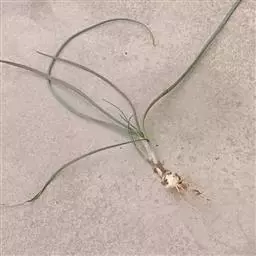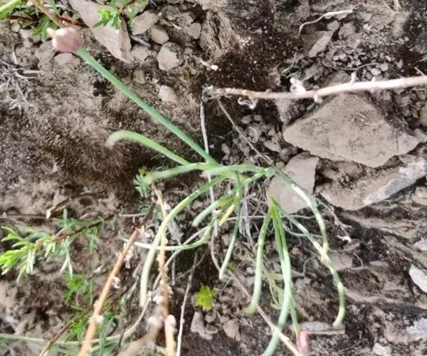 鳞茎近球状,粗0.7~1.5(-2)厘米,基部常具小鳞茎(因其易脱落故在标本上不常见);鳞茎外皮带黑色,纸质或膜质,不破裂,但在标本上多因脱落而仅存白色的内皮。叶3~5枚,半圆柱状,或因背部纵棱发达而为三棱状半圆柱形,中空,上面具沟槽,比花葶短。