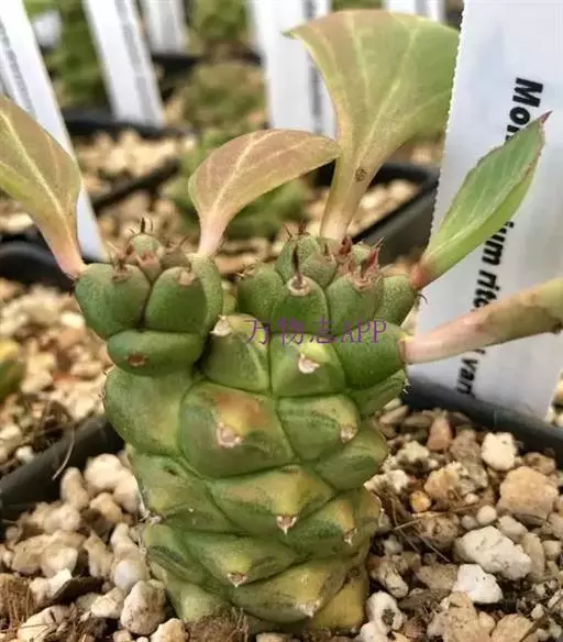将军阁为多年生肉质植物,植株低矮,基部多分枝,茎及分枝均为肉质,呈圆柱形,粗约1厘米,长10厘米左右,深绿或浅绿色,有线状凹纹。小叶轮生,叶片卵圆形,绿色,稍具肉质,有细毛,边缘稍有波状起伏。假伞形花序,小花黄绿色。同属中见于栽培的还有高山单腺戟(M. montanum),其肉质根球状,表皮灰白色,通常有一半露出土面。分枝细柱状,倾斜生长,肉质叶椭圆形,顶端有尖,绿色中杂有紫斑,花灰绿色。而将军阁(M.ritchiei var.nyambense)则是本属中的另一种类型,易分枝的肉质茎最初呈圆球状,以后逐渐呈高约40厘米的圆柱状,其表面布满瘤状凸起。叶椭圆形,稍具肉质,正面深绿色,有明显的灰白色脉纹,叶背颜色稍浅。花淡粉红色。植株受到长期光照,可变成紫红色。 将军阁 将军阁