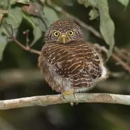 东方角鸮(学名:Otus sunia),是脊索动物门,鸟纲,鸮形目,鸱鸮科的一种鸟类。国家二级重点保护野生动物,CITES附录Ⅱ级。相貌十分符合公众对猫头鹰形象的印象,圆脸庞,大眼睛,还有一双直立的“耳朵”——其实那是耳孔附近生长的羽毛,据说有促进声波聚焦的功效。东方角鸮十分娇小,即使伸直脖子挺胸抬头也不过两个拳头叠起来这么高,而且浑圆的头部占了很大比例。