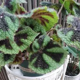 由漆斑菌(Myrotheciumroridum)引起的秋海棠叶斑病症状:病症一般出现在秋海棠叶片边缘、叶尖和破损叶片的叶脉上。坏死区域呈现黑褐色,然后是水渍状。诊断方法是下部的叶片经常会不规则形状的孢子群,中央呈黑色,但边缘为白色。