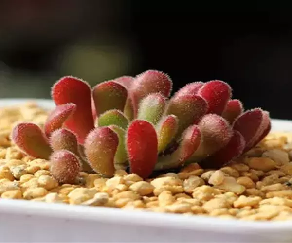 红稚儿Crassula pubescens subsp. radicans Toelken为景天科、青锁龙属多肉植物。植株丛生,有细小的分枝,茎肉质,时间养久了茎会逐渐半木质化,红稚儿叶片有点薄,叶片颜色绿。颜色反差巨大,平时为绿色,日照充足的春秋季节,变为火红色。野外分布于南非东开普省布什维德谷。喜温暖干燥和阳光充足的环境,怕低温和霜雪,耐半阴。叶形叶色较美,有一定的观赏价值;盆栽可放置于电视、电脑旁,可吸收辐射,亦可栽植于室内以吸收甲醛等物质,净化空气。