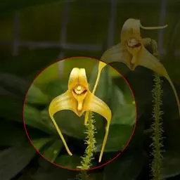 花序顶生,直立,长7-9厘米,具1花;花序柄无毛;花苞片不存在;子房长约1厘米,有3纵棱,棱上疏被短柔毛或近无毛;花较小,通常萼片与花瓣淡绿色而有密集的褐色条纹,唇瓣金黄色;中萼片椭圆形或卵状椭圆形,长1.5-2厘米,宽7-9毫米,先端急尖或有短尖头,无毛;合萼片与中萼片相似,但较短,长1.3-1.8毫米,先端2浅裂。