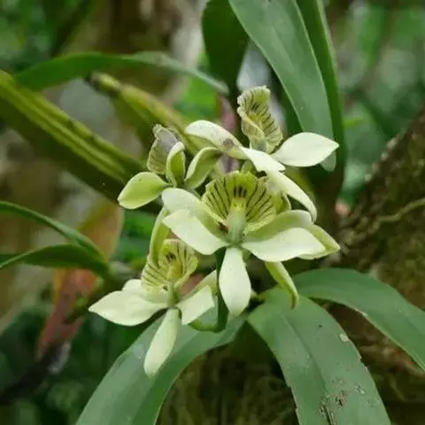 苞舌兰:假鳞茎扁球形,通常粗1-2.5厘米,被革质鳞片状鞘,顶生1-3枚叶。叶带状或狭披针形,…