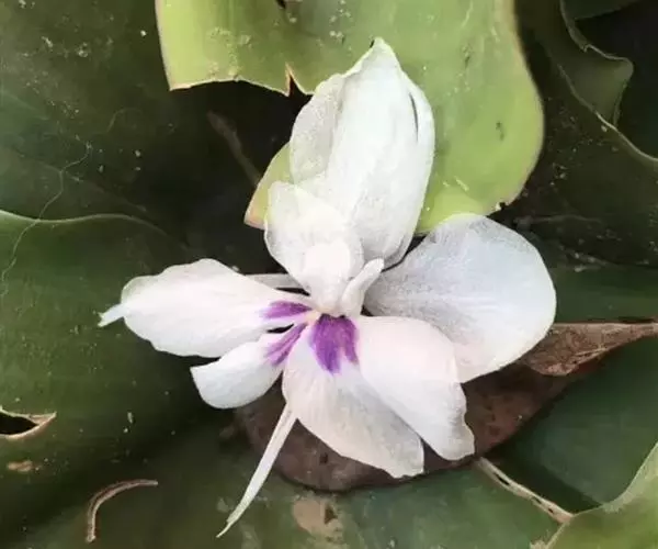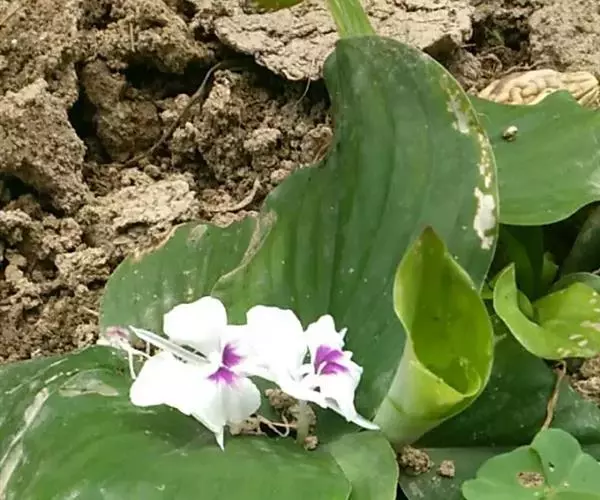 花4-12朵顶生,半藏于叶鞘中;苞片披针形,长2.5厘米;花白色,有香味,易凋谢;花萼约与苞片等长;花冠管长2-2.5厘米,裂片线形,长1.2厘米;侧生退化雄蕊倒卵状楔形,长1.2厘米;唇瓣白色,基部具紫斑,长2.5厘米,宽2厘米,深2裂至中部以下;雄蕊无花丝,药隔附属体正方形,2裂。