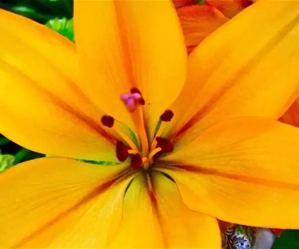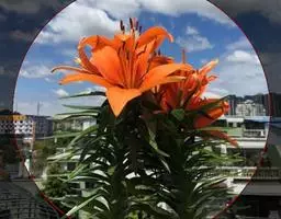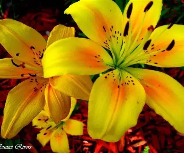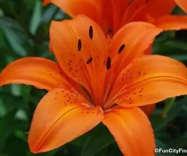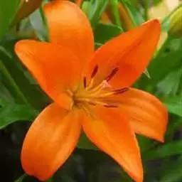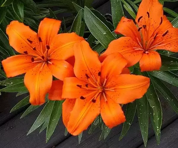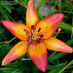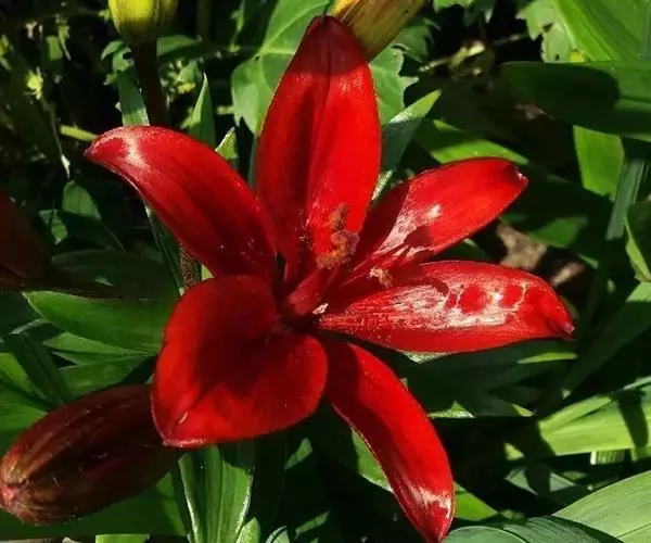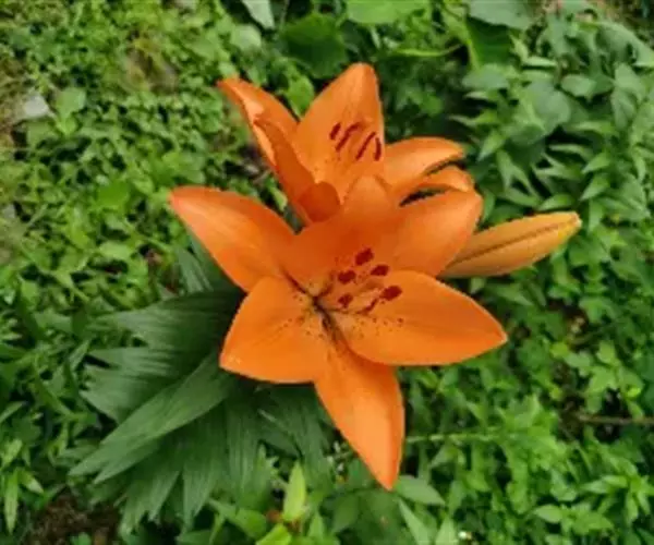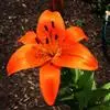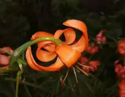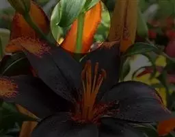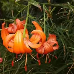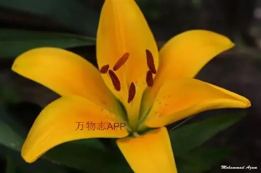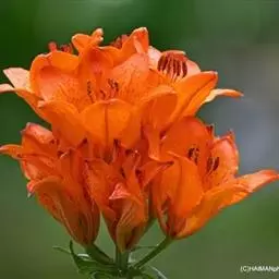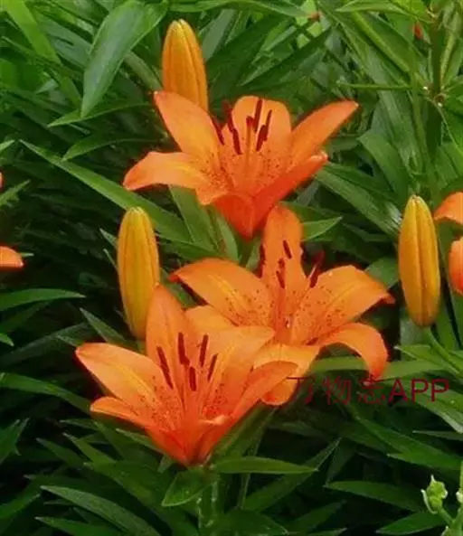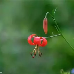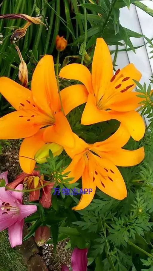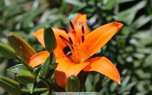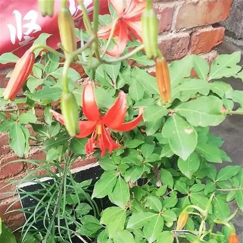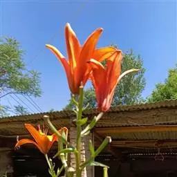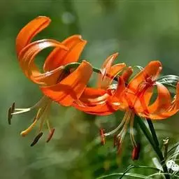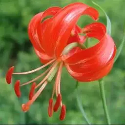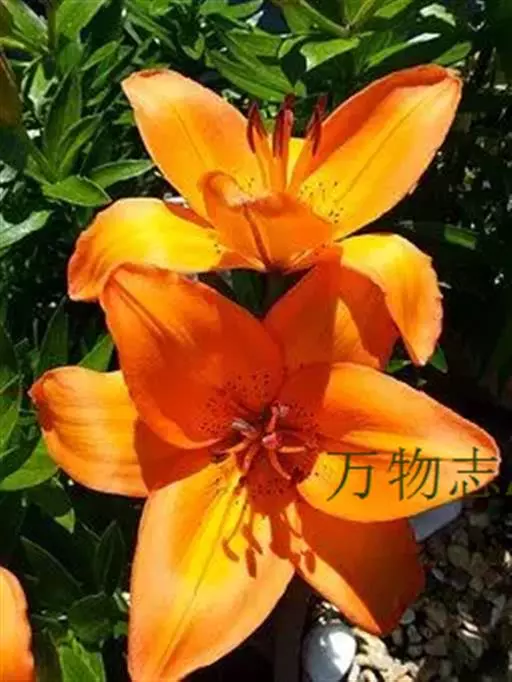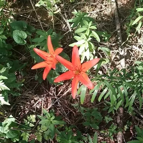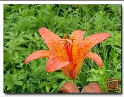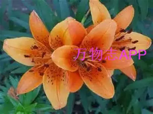 毛百合(学名:Lilium dauricum Ker Gawl.):鳞茎卵状球形,高约1.5厘米,直径约2厘米;鳞片宽披针形,长1-1.4厘米,宽5-6毫米,白色,有节或有的无节。茎高50-70厘米,有棱。叶散生,在茎顶端有4-5枚叶片轮生。花1-2朵顶生,橙红色或红色,有紫红色斑点;外轮花被片倒披针形,内轮花被片稍窄,蜜腺两边有深紫色的乳头状突起。蒴果矩圆形,长约4-5.5厘米,宽3厘米。花期6-7月,果期8-9月。