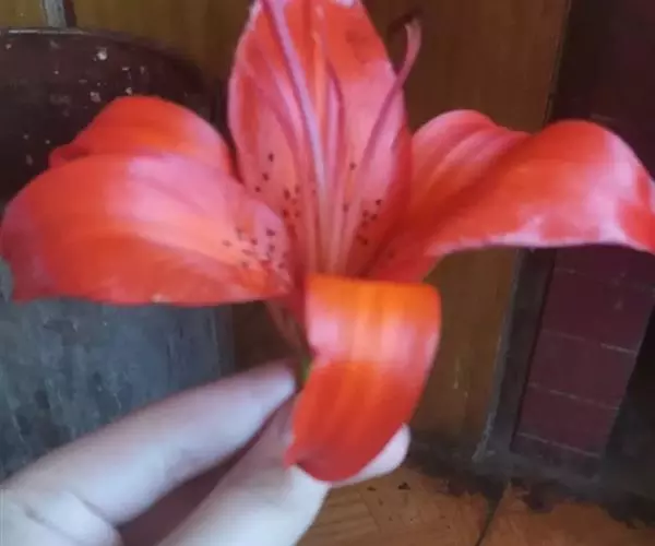 苞片叶状,长4厘米;花梗长(1-)2.5-8.5厘米,有白色绵毛;花1-2朵顶生,橙红色或红色,有紫红色斑点;外轮花被片倒披针形,先端渐尖,基部渐狭,长7-9厘米,宽1.5-2.3厘米,外面有白色绵毛;内轮花被片稍窄,蜜腺两边有深紫色的乳头状突起;雄蕊向中心靠拢;花丝长5-5.5厘米,无毛,花药长约1厘米;子房圆柱形,长约1.8厘米,宽2-3毫米;花柱长为子房的2倍以上,柱头膨大,3裂。