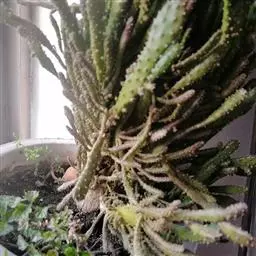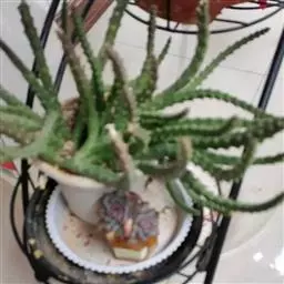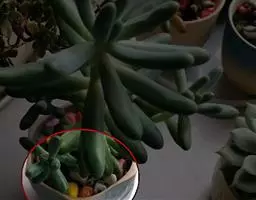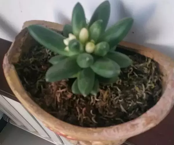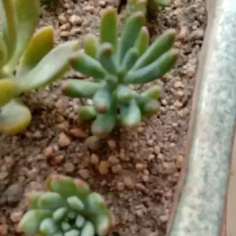 茎10厘米高,叶30-60枚,略扁的圆柱形,互生,淡绿至灰白色,被白粉。2-4厘米长 千代田之松 ,1.2、1.6厘米宽,0.9-1.2厘米厚,圆润,但尖端部分略有棱。花序30厘米高,小花懦红色。