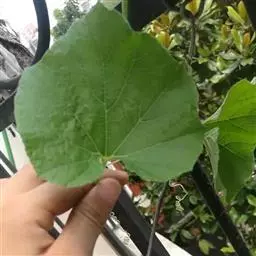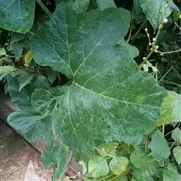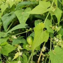节瓜 一年生蔓生或架生草本;茎被黄褐色硬毛及长柔毛,有棱沟。叶柄粗壮,长5-20厘米,被黄褐色的硬毛和长柔毛;叶片肾状近圆形,宽15-30厘米,5-7浅裂或有时中裂,裂片宽三角形或卵形,先端急尖,边缘有小齿,基部深心形,弯缺张开,近圆形,深、宽均为2.5-3.5厘米,表面深绿色,稍粗糙,有疏柔毛,老后渐脱落,变近无毛;背面粗糙,灰白色,有粗硬毛,叶脉在叶背面稍隆起,密被毛。卷须2-3歧,被粗硬毛和长柔毛。