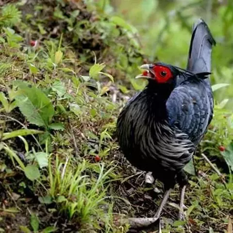 黑尾原鸡:雄鸟体型较大,体羽艳丽且金属光泽;脸部裸皮、有红色肉冠及肉垂,大而显著;中央两枚尾羽延长…