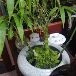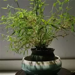 将分切好的种苗直立栽人口径约10厘米,高度约7厘米的小瓦盆中,素土填实。然后按15厘米x20厘米的株行距,连同小盆一起,栽植在苗畦中,使盆面与土面平齐,然后灌水,栽好之后,由于种苗根部被小盆匡束住,不能正常生长。于夏、秋二季抽生出的竹秆即长得极度矮小,高不盈尺,适于盆栽观赏的小型化竹株;第二年春天,就可做盆景用竹了。