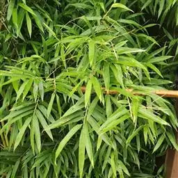 凤尾竹 Raeusch. ex Schult. ’Fernleaf’ R. A. Young)是禾本科,簕竹属孝顺竹的变种。植株较高大,杆高可达6米,竿中空,小枝稍下弯,下部挺直,绿色;竿壁稍薄;节处稍隆起,无毛;叶鞘无毛,纵肋稍隆起,背部具脊;叶耳肾形,边缘具波曲状细长繸毛;叶舌圆拱形,叶片线形,上表面无毛,下表面粉绿而密被短柔毛,小穗含小花,中间小花为两性;外稃两侧稍不对称,长圆状披针形,先端急尖;内稃线形,脊上被短纤毛,花药紫色,子房卵球形,羽毛状。成熟颖果未见。原产中国,华东、华南、西南以至台湾、香港均有栽培。凤尾竹喜温暖、湿润和阳光充足的环境,耐寒。宜土层深厚、肥沃、疏松的微酸性壤土。该种观赏价值较高,宜作庭院丛栽,也可作盆景植物。全草或根入药,味淡、微苦,性寒,有清热利湿、凉血止血、消肿解毒功效,可治痢疾、泄泻等多种病症。凤尾