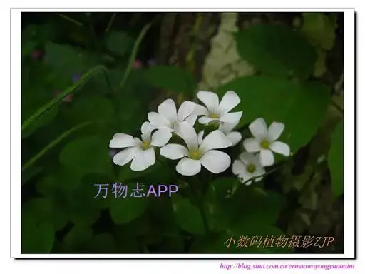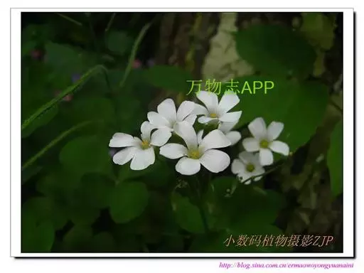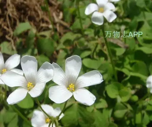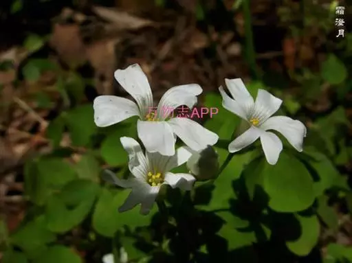 白花酢浆草(学名:Oxalis acetosella Linn.):又名山酢浆草,是酢浆草科酢浆草属的多年生草本植物,具有匍匐的根茎;小叶3,倒心形;花通常白色,单生。