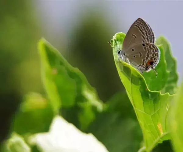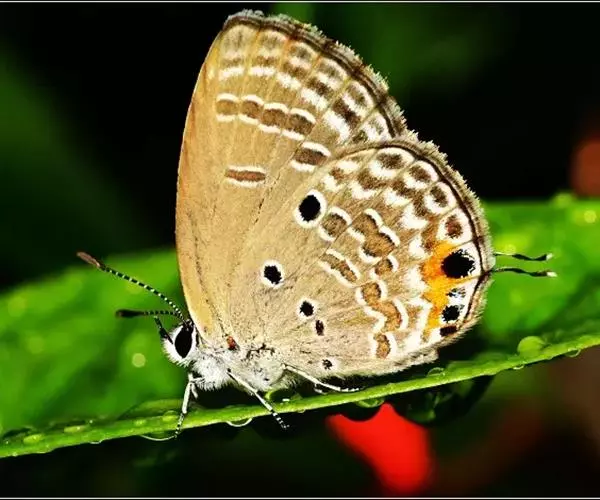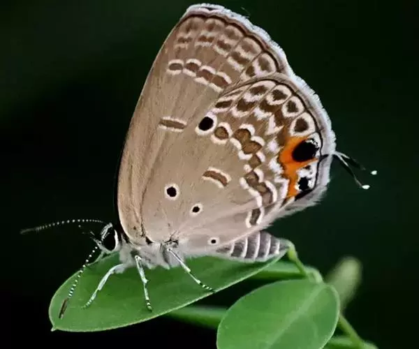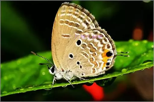 曲纹紫灰蝶(学名:Chilades pandava )是鳞翅目灰蝶科昆虫。成虫体长10-12毫米,翅展20-35毫米,翅面紫蓝色,前翅外缘黑色,后翅外缘有细的黑白边。翅反面灰褐色,缘毛褐色,两翅均具黑边。后翅有2条带内侧有新月纹白边,翅茎有3个黑斑,都有白圈。尾突细长,端部白色。