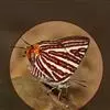 红珠灰蝶翅白色,半透明羽毛状。前翅及前缘布各有一层橙色鳞片。中室中部及横脉处各有不同大小黑色斑。…
