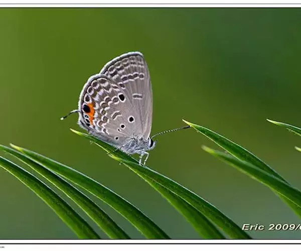成虫:体长10-12毫米,翅展20-35毫米,翅面紫蓝色,前翅外缘黑色,后翅外缘有细的黑白边,其内为黑色窄带。翅反面灰褐色,缘毛褐色,两翅均具黑边,前翅亚外缘有2条具白边的灰白带,后中横斑列也具白边,在2a和Cu2室的斑斜,中室端纹棒状。后翅有2条带内侧有新月纹白边,Cu2室端黑色冠以大的橙黄斑,后中横斑列中前端1个黑斑和m2至Cu2室3斑连成一曲纹,翅茎有3个黑斑,都有白圈。尾突细长,端部白色。