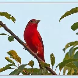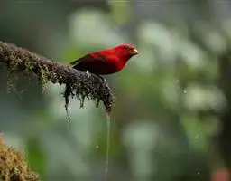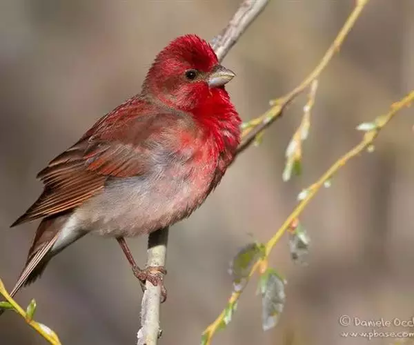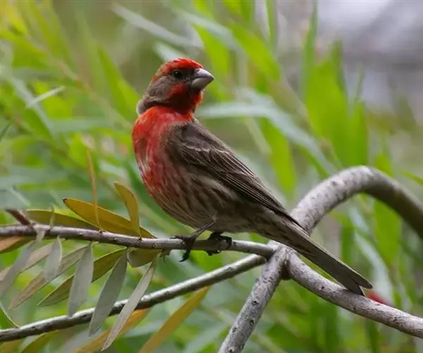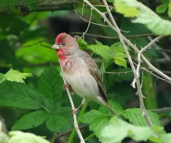 普通朱雀(学名:Carpodacus erythrinus):是鸟纲、雀科的小型鸟类,体长13-16厘米。雄鸟头顶、腰、喉、胸红色或洋红色,背、肩褐色或橄榄褐色,羽缘沾红色,两翅和尾黑褐色,羽缘沾红色。雌鸟上体灰褐或橄榄揭色、具暗色纵纹,下体白色或皮黄白色、亦具黑褐色纵纹。