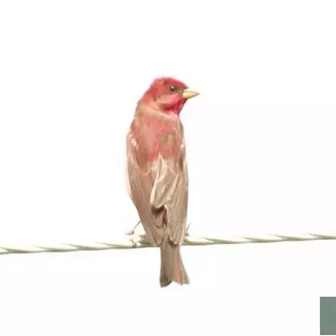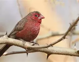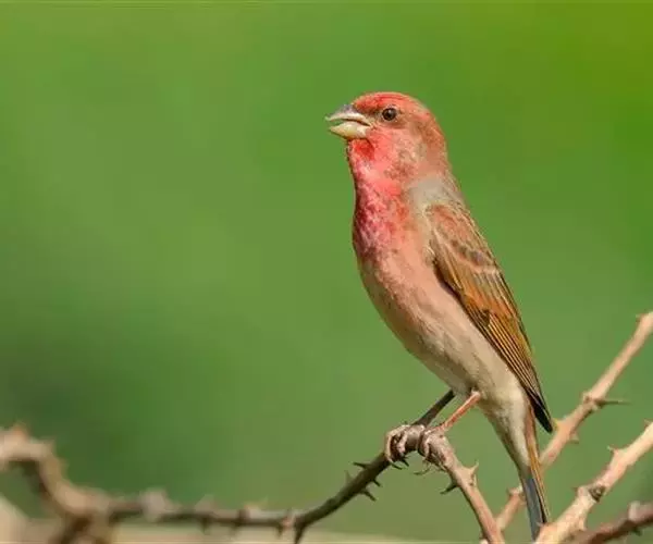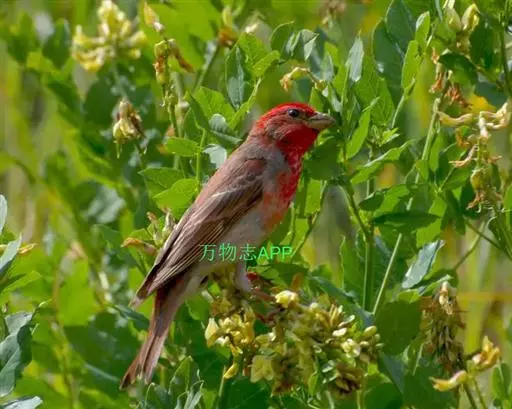 红腰朱雀:体长12-14厘米,小型鸟类。雄鸟前额和眉纹玫瑰粉红色,头顶和一宽的贯眼带深红褐色,背红…