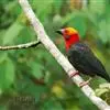 长尾朱雀:体长18厘米,体重16-26克。雄鸟额、颏和眼后为暗红色,…