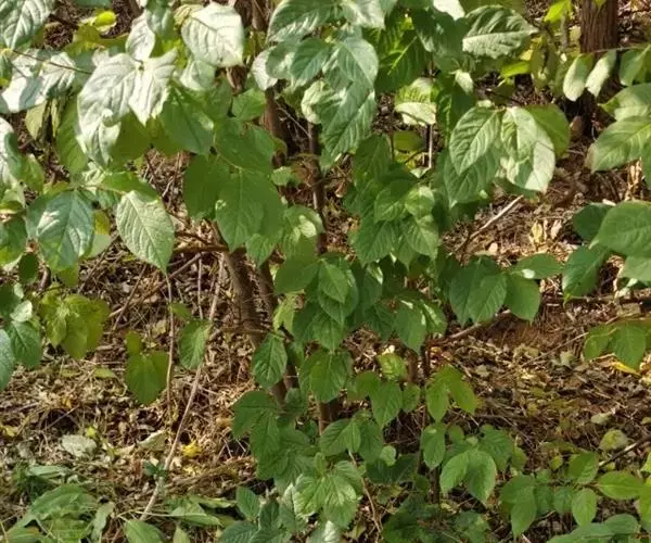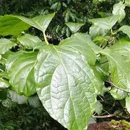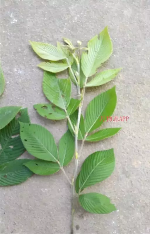 高1-3米;树皮灰白色或灰褐色,皮孔凸起;小枝对生,无毛或幼时被疏微毛;芽藏于叶柄基部之内。叶宽卵状椭圆形、卵圆形或倒卵形,长11-26厘米,宽8-16厘米,基部两侧略不对称,叶缘全缘或有不规则的细齿,叶面有光泽,略粗糙,无毛,叶背幼时沿脉上被褐色硬毛,老渐无毛;叶柄长1.2-1.8厘米,被黄色硬毛,后变无毛。