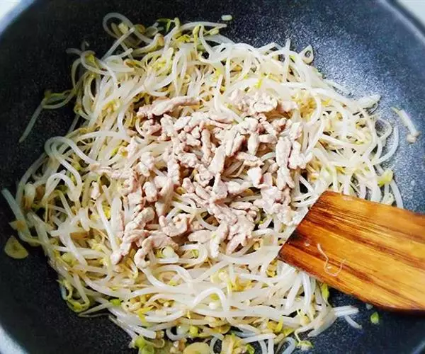 ⒉锅内加油30克烧热,放入葱(切丝)、姜(切丝)炝锅,放入绿豆芽用旺火翻炒,加入精盐、料酒、肉丝、味精炒匀,出锅装盘即成。