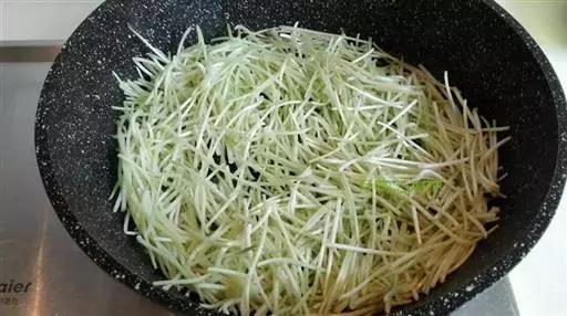 ⒉锅内注入清水,水沸后,倒入绿豆芽,约半分钟,急速捞出,立即放入凉水中过凉,捞出,控净水分。
