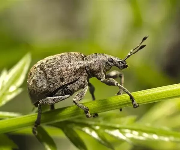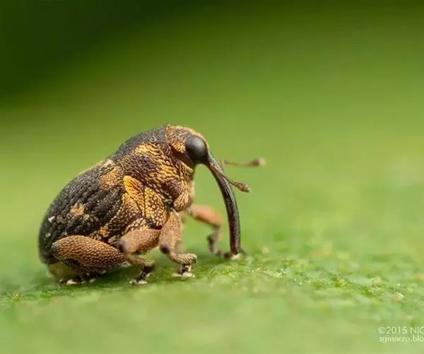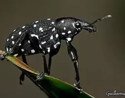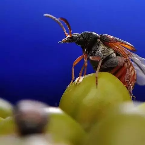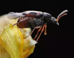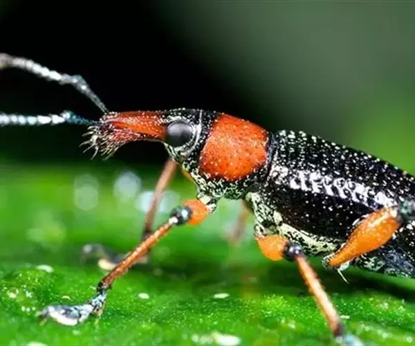 甘薯小象虫属鞘翅目,蚁象虫科。成虫体长5~8毫米,体形细长如蚁。全体除 触角 末节、前胸和 足呈桔红色外,其余均为蓝黑色而有金属光泽。头部延伸成细长的喙,状如象鼻,咀嚼式口器着生于喙的末端。膝状触角10节,雄虫触角末节成棍棒状,雌虫则成长卵状。前胸长为宽的2倍,在后部1/3处缩入如颈状。两鞘翅合起来呈长卵形,显著隆起。鞘翅表面具不明显的小刻点。足细长。卵椭圆形,长约0.6毫米,初产时乳白色,后变淡黄色,表面有小刻点。
