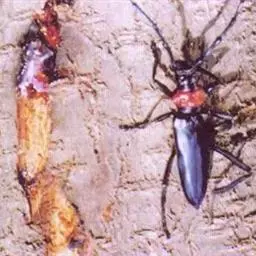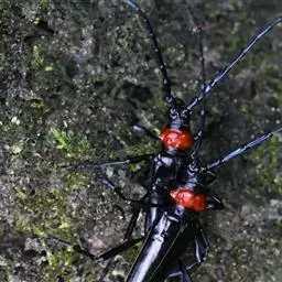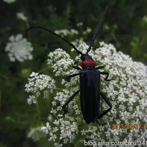 桃红颈天牛是天牛科、颈天牛属昆虫。体黑色发亮,前胸背面大部分为光亮的棕红色或完全黑色。头黑色,…