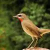红尾歌鸲:体长13-15厘米。上体橄榄褐色。尾羽棕栗色,眼先和颊黄褐色,眼周淡黄褐色。…