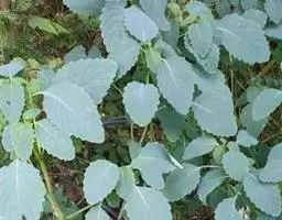 叶互生,在下部有叶柄,在上部无叶柄,叶片卵形或卵圆形,长2-7厘米,宽1.5-5厘米,顶部钝,基圆、截平或心形,边缘波形或钝圆齿,上表面灰绿色,下表面淡绿色,侧脉6-7对。