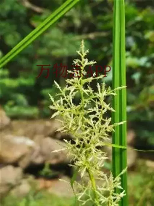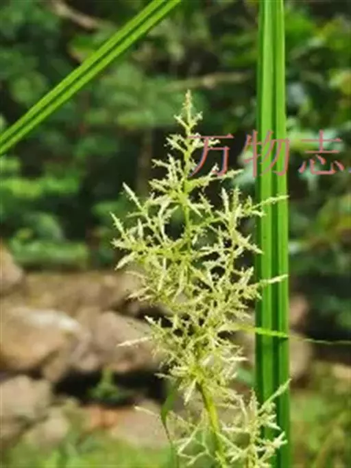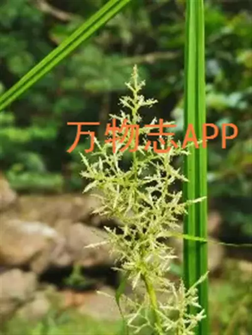 圆锥花序复出,长20-40厘米;支圆锥花序数个,通常单生,少有双生,轮廓为卵状三角形,长4-15厘米,宽3-6厘米,支花序柄坚挺,钝三棱形,最下部1个长10-18厘米,向上部的渐短,平滑;支花序轴锐三棱形,密生短粗毛;小苞片鳞片状,长约1.5毫米,背面被短粗毛;枝先出叶囊状、内无花,背面有数脉,被短粗毛。小穗极多数,全部从枝先出叶中生出,横展,长5-12毫米,两性,雄雌顺序;雄花部分与雌花部分近等长。