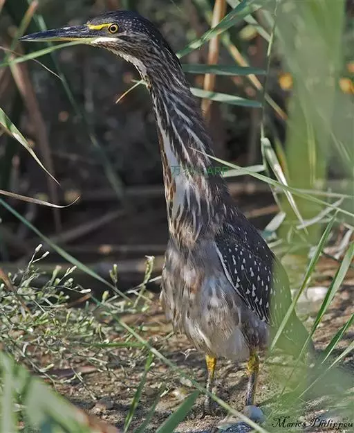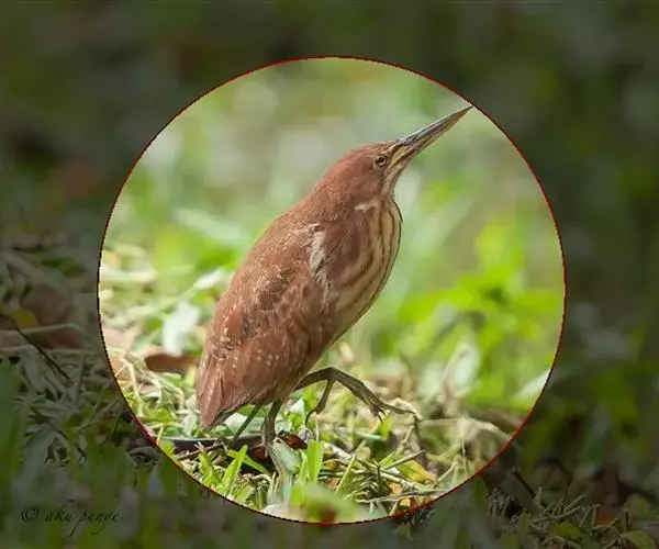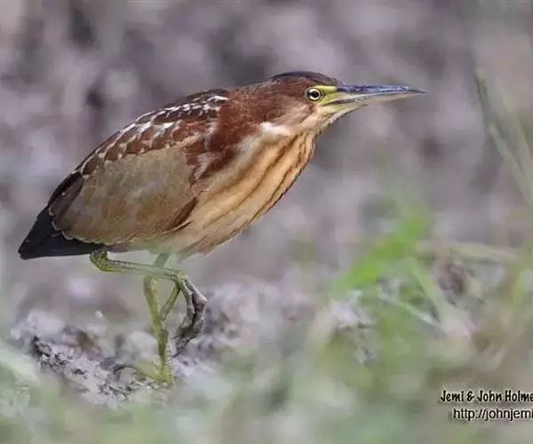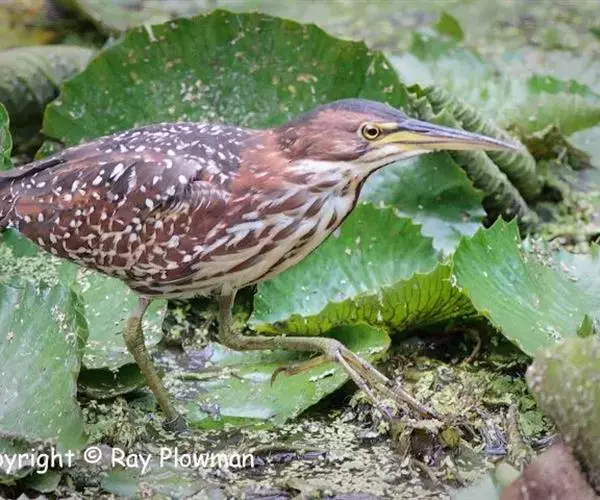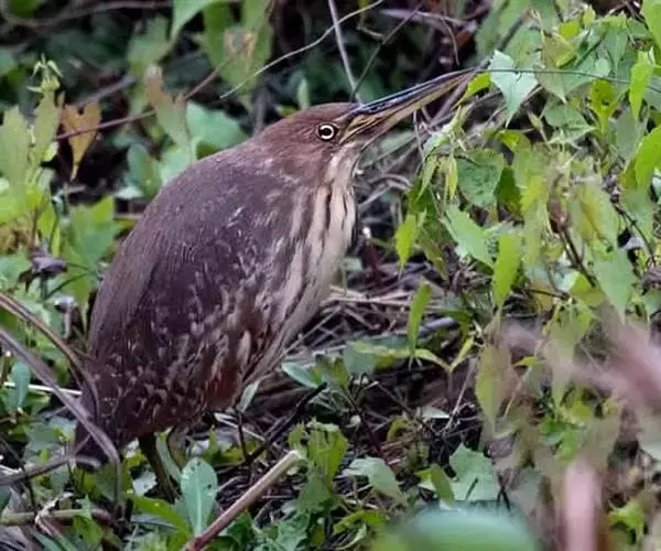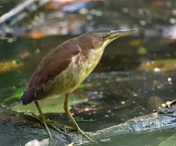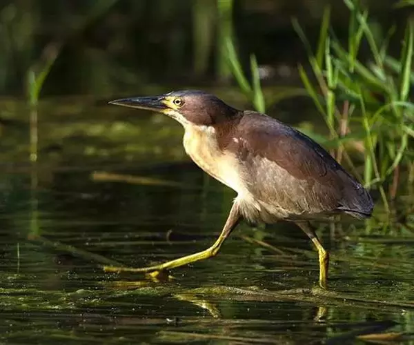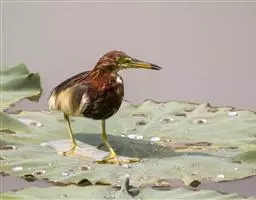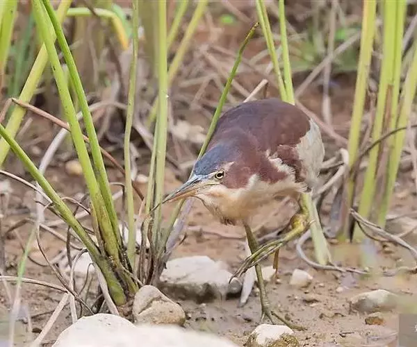 紫背苇鳽是一种中型涉禽。雄鸟上体紫栗褐色,头顶较暗,呈暗栗褐色,背紫栗色。腿和尾上覆羽暗栗褐色。尾羽和飞羽黑褐色.翅上小覆羽暗栗色,中覆羽和大覆羽橄榄灰黄色,初级覆羽黑褐色,羽端白色;颊和颈侧紫栗色。下体土黄色,自颏经前颈到胸部中央有一暗色纵纹,喉侧、颈侧浅土黄白色,胸侧有黑褐色斑点。尾下覆羽白色,翅下覆羽淡黄白色,腋羽灰白色。
