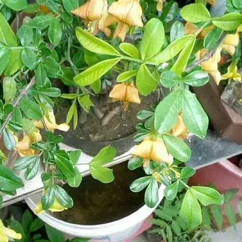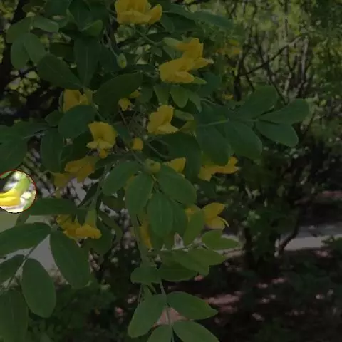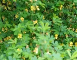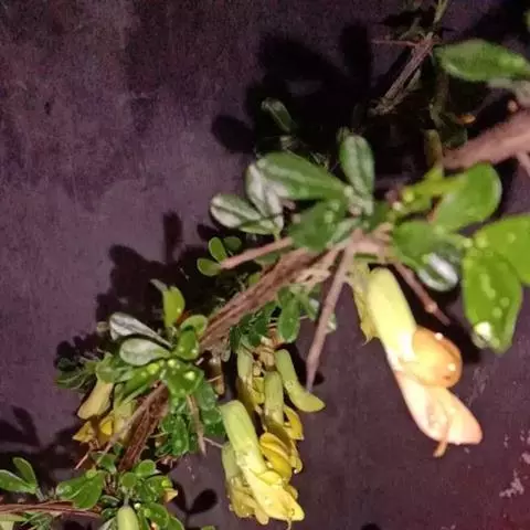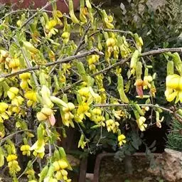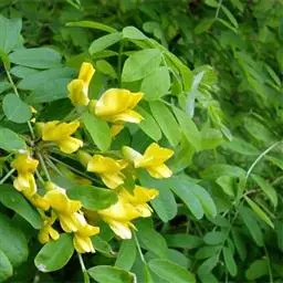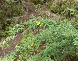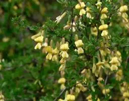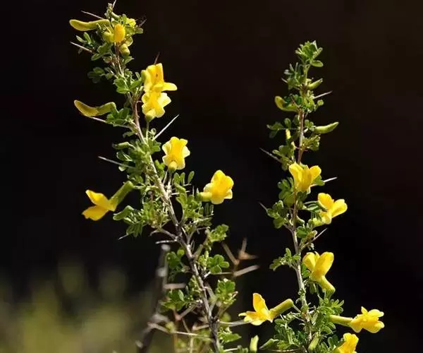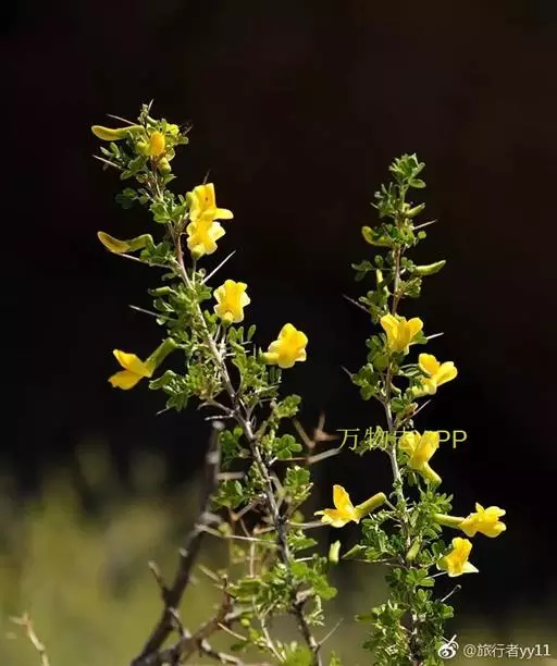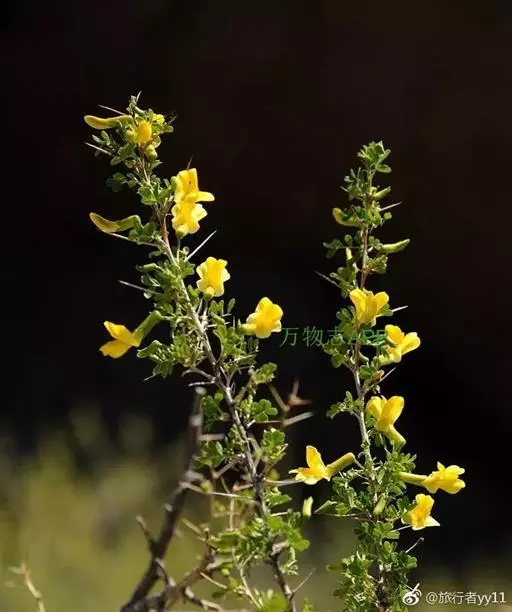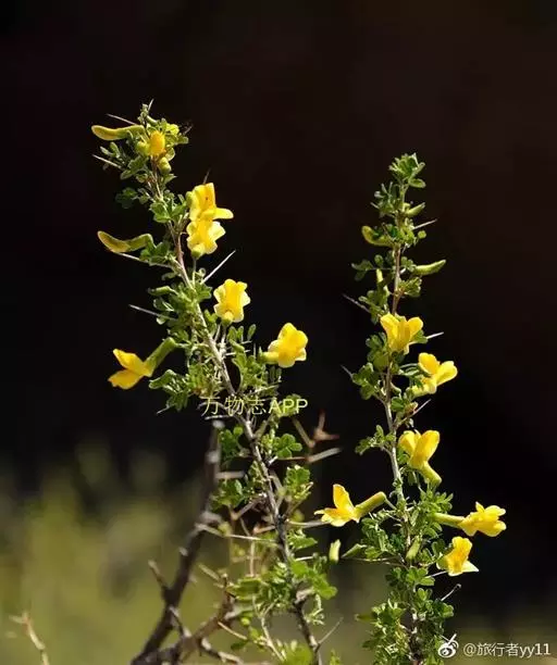 灌木,高0.7-1.5厘米,由基部多分枝。老枝深灰色,一年生枝浅褐色,嫩枝有条棱,被伏贴短柔毛。羽状复叶有 (2) 3-4(5)对小叶;托叶在长枝者硬化成针刺,长2-5毫米,宿存,短枝者脱落;叶轴在长枝者硬化成针刺,长1.5-4厘米,宿存,粗壮,短枝者纤细,脱落;小叶倒卵形、狭倒卵形或长圆形,长4-12毫米,宽3-5毫米,先端钝,有刺尖,基部稍狭,两面近无毛或疏被短伏贴柔毛。花梗单生,长1-2.5厘米,中上部具关节,苞片早落;花萼钟状管形,长6-10毫米,近无毛;花冠黄色,长26-30毫米,旗瓣宽卵形,翼瓣长圆形,瓣柄长约为瓣片的1/3-1/2,耳齿状,龙骨瓣的瓣柄长约为瓣片的3/4,耳短小,子房近无毛。荚果长2-3厘米,宽约4毫米。花期4-5月,果期7月 。
