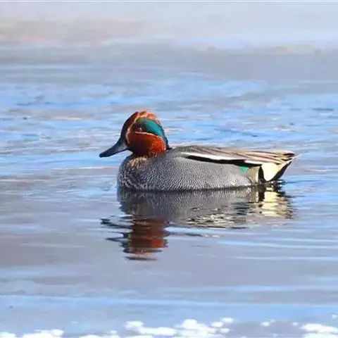 绿翅鸭是小型鸭类,体长37厘米,体重约0.5千克。嘴脚均为黑色。雄鸟头至颈部深栗色,…