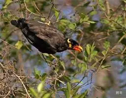 金冠树八哥为椋鸟科树八哥属的鸟类。体长约23厘米,闪辉黑色。特征为具翼斑及颏黄色,脸颊裸露皮肤粉黄色。…