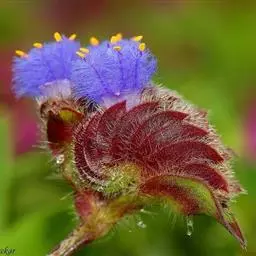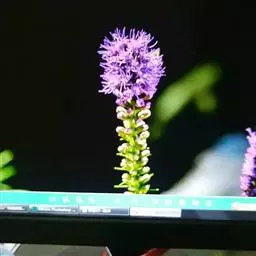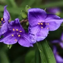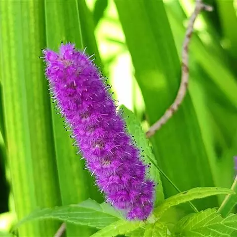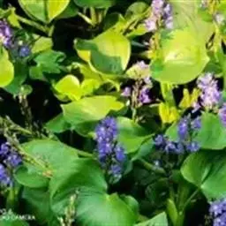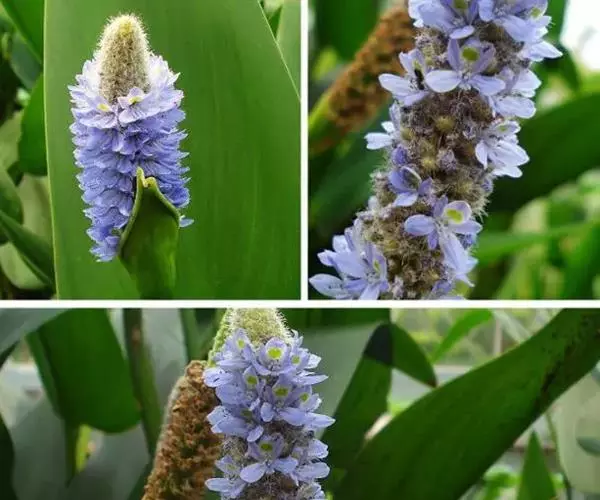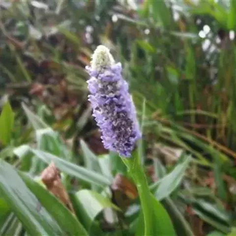 梭鱼草 穗状花序顶生,长5-20厘米,小花密集在200朵以上,蓝紫色带黄斑点,直径约10毫米左右,花被裂片6枚,近圆形,裂片基部连接为筒状。果实初期绿色,成熟后褐色;果皮坚硬,种子椭圆形,直径1-2毫米。花果期5-10月。