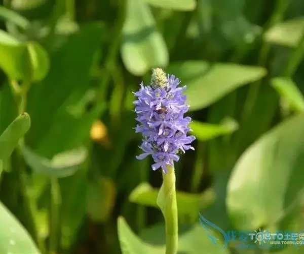 梭鱼草(学名:Pontederia cordata L.)是雨久花科,梭鱼草属多年生挺水或湿生草本植物,株高可达150厘米,地茎叶丛生,圆筒形叶柄呈绿色,叶片较大,深绿色,表面光滑,叶形多变,但多为倒卵状披针形。花葶直立,通常高出叶面,穗状花序顶生,每条穗上密密的簇拥着几十至上百朵蓝紫色圆形小花,上方两花瓣各有两个黄绿色斑点,质地半透明,5-10月开花结果。